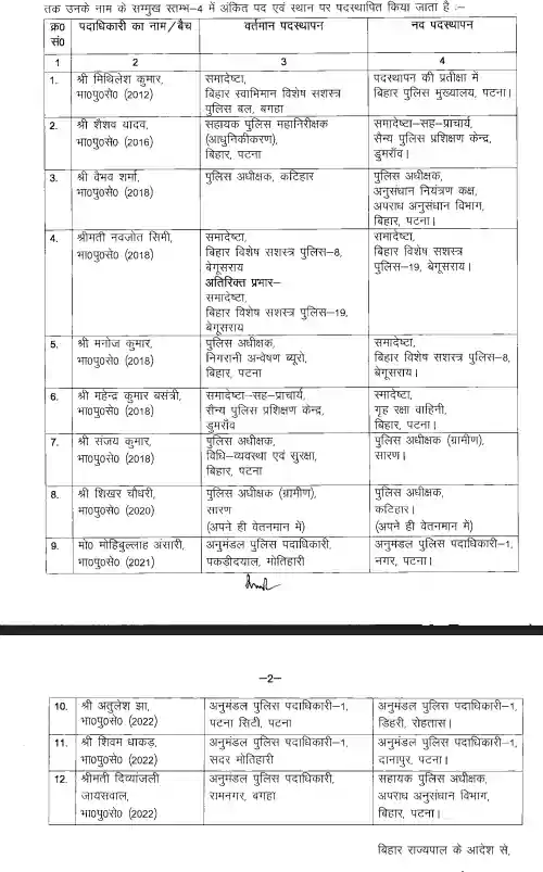 पटना निगरानी अन्वेषण ब्यूरो के एसपी मनोज कुमार को बीएमपी-8 (बिहार मिलिट्री पुलिस), बेगूसराय का समादेष्टा बनाया गया है।