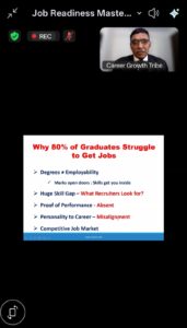 वेबिनार के मुख्य वक्ता और इंडस्ट्री एक्सपर्ट राजन के. प्रसाद ने छात्रों को संबोधित करते हुए रिज्यूमे बिल्डिंग, इंटरव्यू स्किल्स और पर्सनल ब्रांडिंग के गुर साझा किए। उन्होंने बताया कि कैसे सही रणनीति अपनाकर छात्र अपनी ड्रीम जॉब हासिल कर सकते हैं।