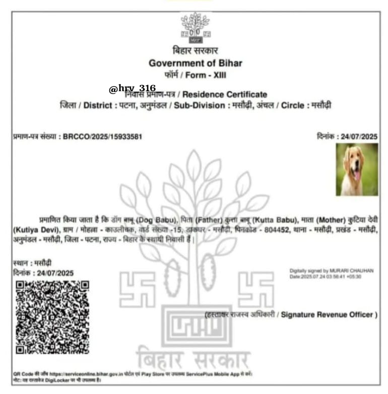 दस्तावेज में लिखा गया है कि डॉग बाबू, पिता कुत्ता बाबू, माता कुतिया देवी, मसौढ़ी के वार्ड संख्या 15 में निवास करते हैं। दस्तावेज पर राजस्व अधिकारी के डिजिटल हस्ताक्षर और QR कोड भी मौजूद है, जिससे उसकी प्रामाणिकता पर सवाल उठ रहे हैं।