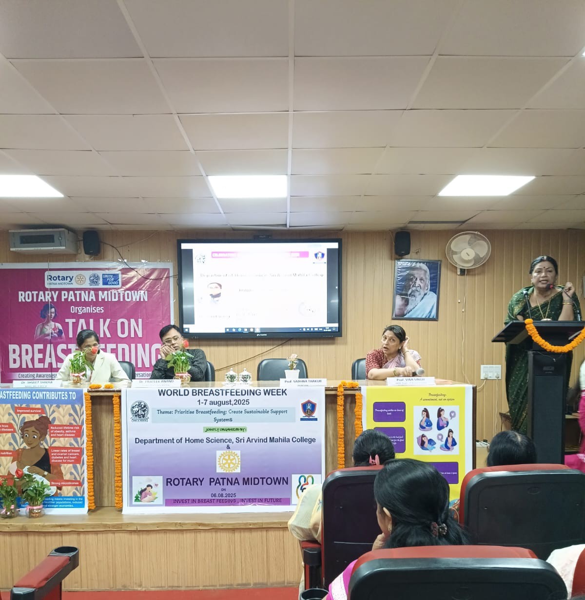 पटना। विश्व स्तनपान सप्ताह के अवसर पर श्री अरविंद महिला कॉलेज, पटना के गृह विज्ञान विभाग एवं रोटरी पटना मिडटॉन के संयुक्त तत्वावधान में दिनांक 06 अगस्त 2025 को एक जागरूकता कार्यक्रम का आयोजन किया गया। इस वर्ष की थीम थी – प्रायोरिटाईज ब्रेस्टफीडिंग, क्रिएट सस्टेनेबल सपोर्ट सिस्टम। कार्यक्रम की शुरुआत विभागाध्यक्ष प्रो. विमी सिंह के स्वागत भाषण एवं विषय प्रवेश से हुई। उन्होंने स्तनपान को एक जैविक प्रक्रिया से इतर, एक सामाजिक एवं सांस्कृतिक कर्तव्य के रूप में परिभाषित करते हुए कहा कि –”स्तनपान मातृत्व का एक नैसर्गिक उपहार है, जो शिशु के शारीरिक, मानसिक एवं भावनात्मक विकास की नींव रखता है। यह केवल व्यक्तिगत नहीं, बल्कि सामाजिक उत्तरदायित्व भी है।” मुख्य वक्ता डॉ. श्वेत शिखा ने “ब्रेस्टफीडिंग: बेस्ट स्टार्ट फॉर योर बेबी” विषय पर सारगर्भित और वैज्ञानिक दृष्टिकोण से विचार प्रस्तुत किए। उन्होंने बताया कि–”मां का दूध शिशु के लिए प्रथम और सर्वोत्तम पोषण है, जो न केवल रोग प्रतिरोधक क्षमता को बढ़ाता है, बल्कि भावनात्मक सुरक्षा भी प्रदान करता है। इसके लिए समाज को सहयोगात्मक दृष्टिकोण अपनाना होगा।”